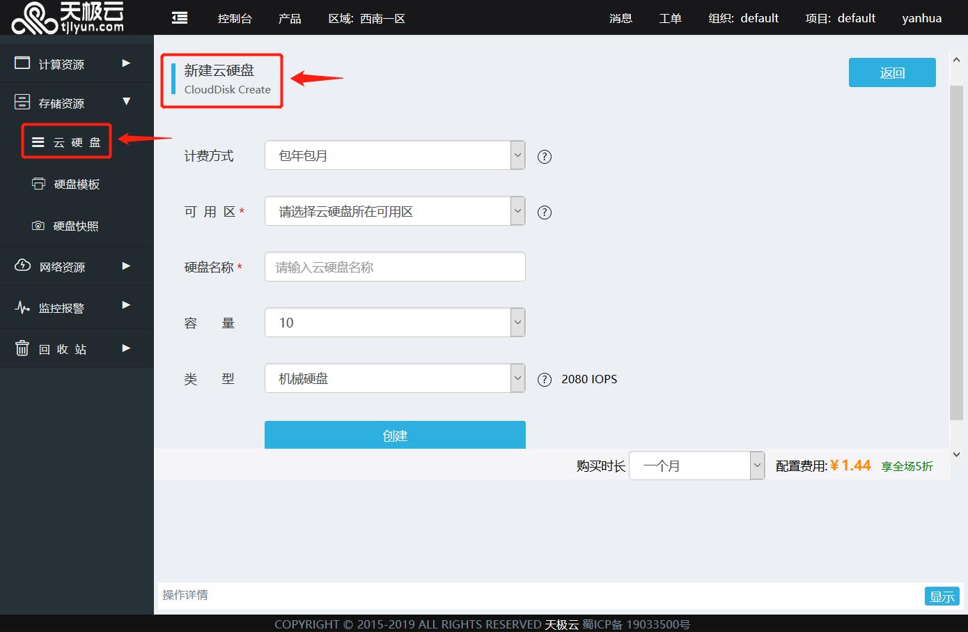 找到左侧菜单【存储资源】-->【云硬盘】界面,点击云硬盘界面右上角【新建云硬盘】按钮,界面跳转到新建云硬盘界面,在新建云硬盘界面中设置云硬盘的相关配置,点击【创建】按钮,系统提示“云硬盘创建成功”,新创建的云硬盘会显示在云硬盘列表中。如果想继续创建云硬盘,重复上述步骤即可。