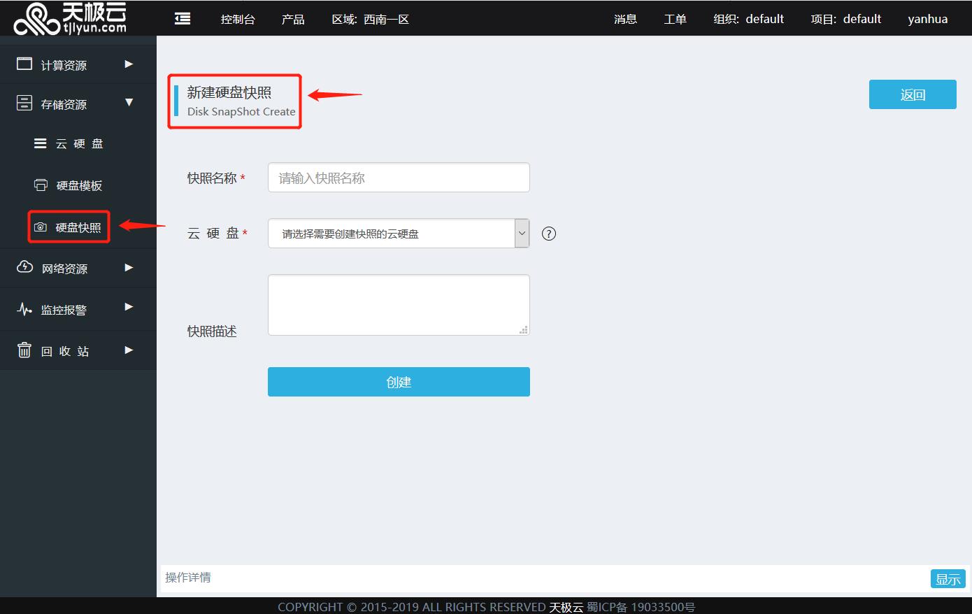 找到左侧菜单【存储资源】-->【硬盘快照】界面,在硬盘快照列表界面右上角点击【新建快照】按钮,界面跳转到新建硬盘快照界面,选择或填写相关快照配置信息,点击【创建】按钮,即可对选择的云硬盘创建备份快照。