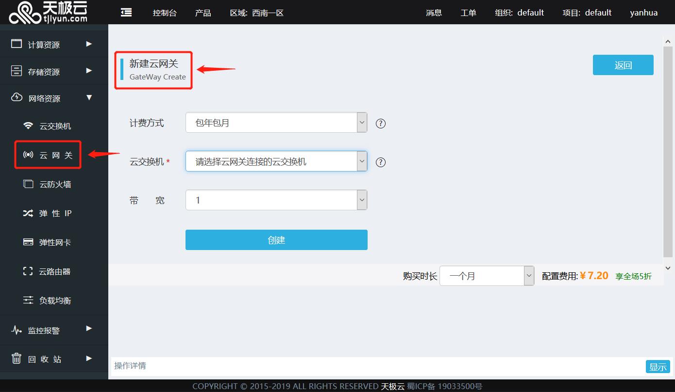 找到左侧菜单【网络资源】-->【云网关】界面,在云网关列表界面右上角点击【新建云网关】按钮,界面跳转到新建云网关界面,选择相关云网关配置信息,点击【创建】按钮,即可创建云网关。