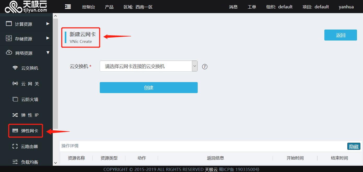 找到左侧菜单【网络资源】-->【弹性网卡】界面,在弹性网卡列表界面右上角点击【新建云网卡】按钮,界面跳转到新建云网卡界面,选择云网卡连接的云交换机,点击【创建】按钮,即可创建云网卡。