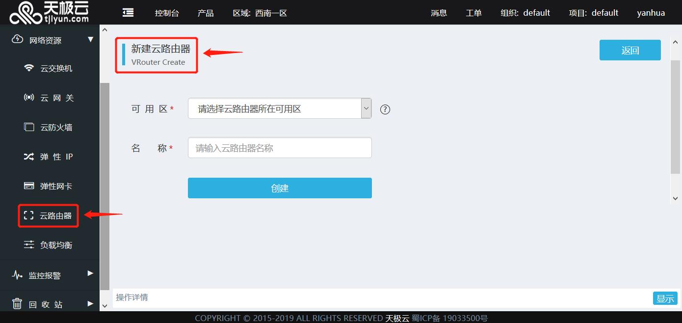 找到左侧菜单【网络资源】-->【云路由器】界面,在云路由器列表界面右上角点击【新建云路由器】按钮,界面跳转到新建云路由器界面,选择或输入云路由器相关配置信息,点击【创建】按钮,即可创建云路由器。
