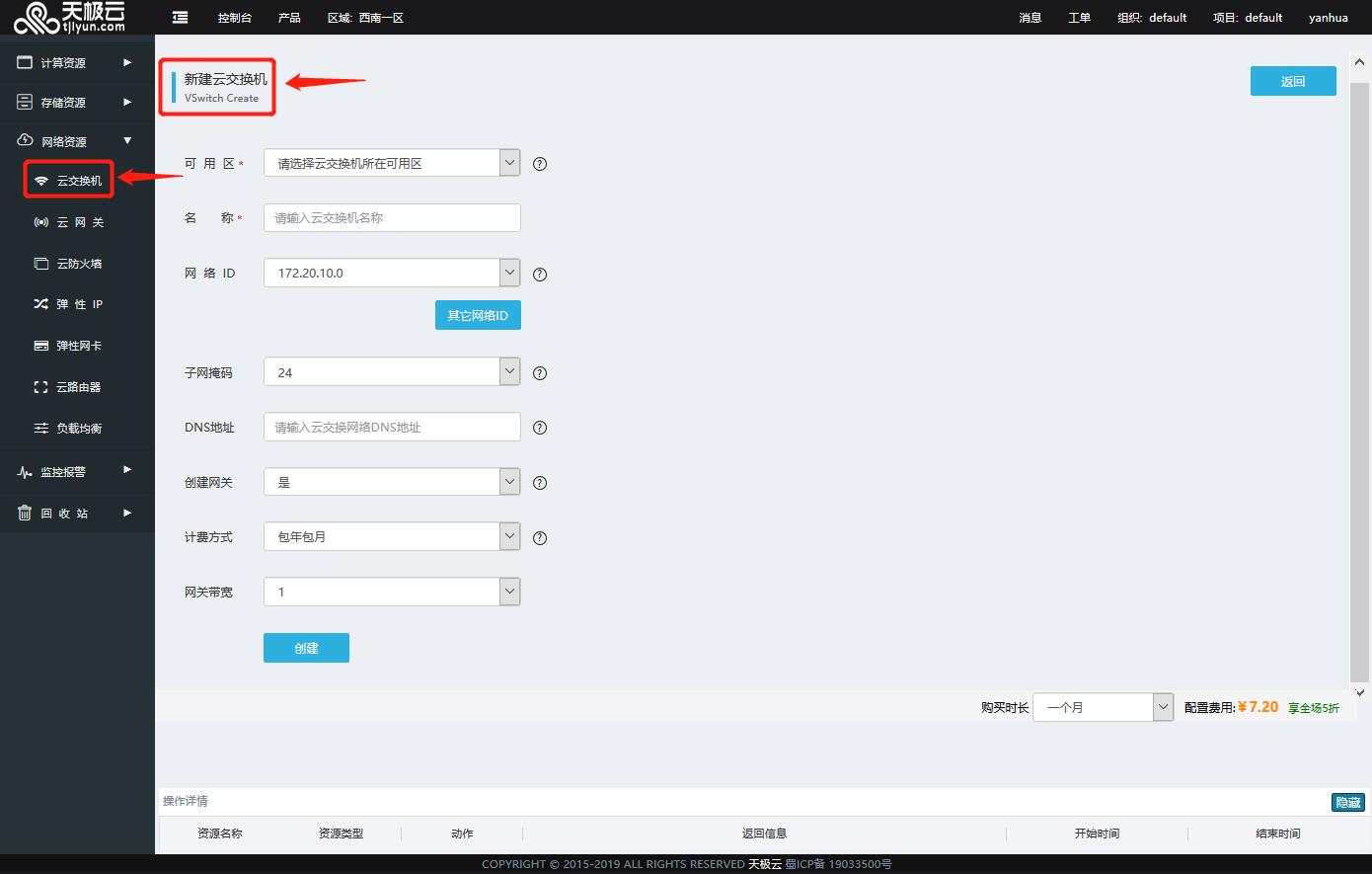找到左侧菜单【网络资源】-->【云交换机】界面,在云交换机列表界面右上角点击【新建云交换机】按钮,界面跳转到新建云交换机界面,选择或填写相关云交换机配置信息,点击【创建】按钮,即可创建属于自己的云交换机。