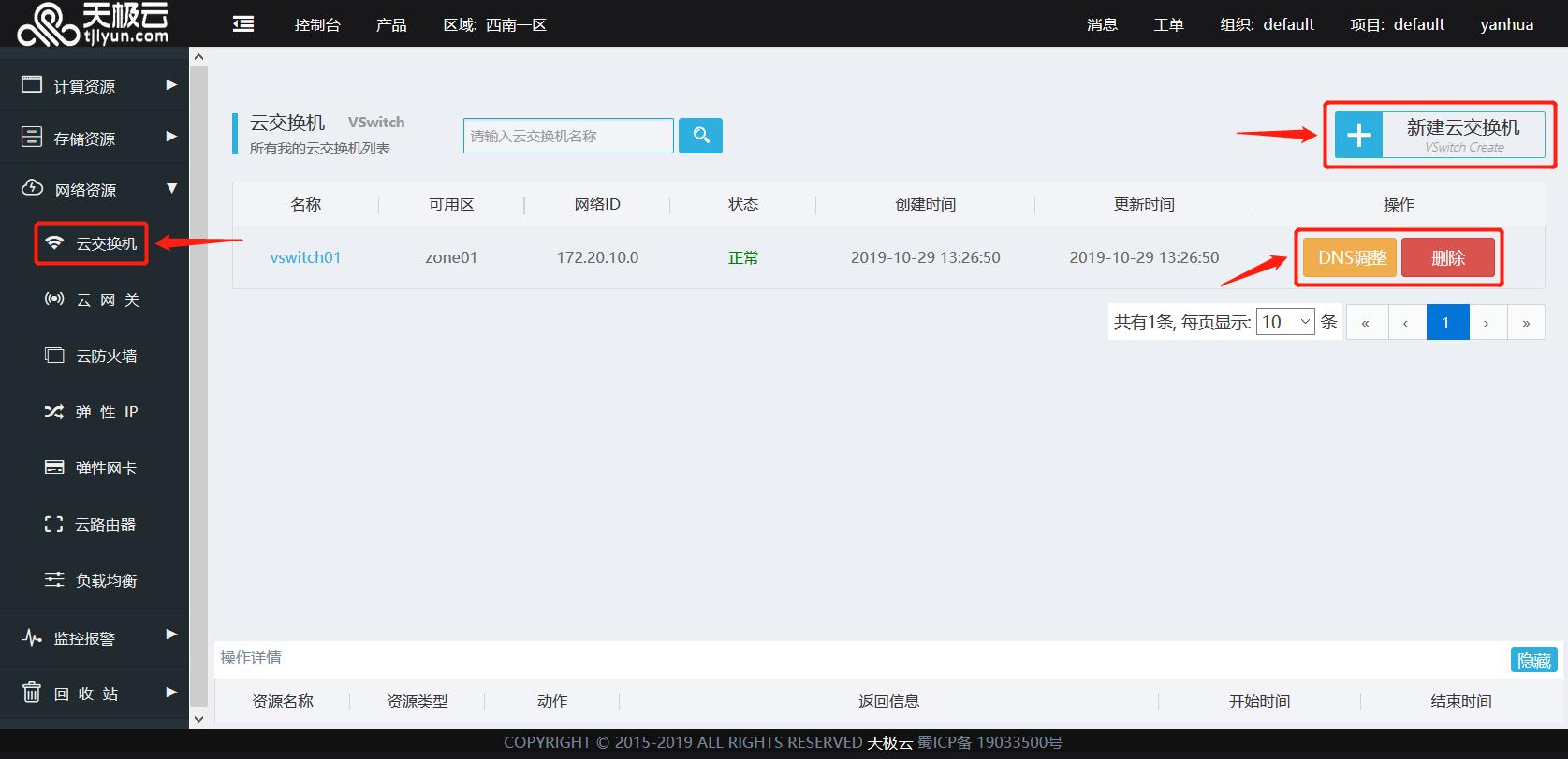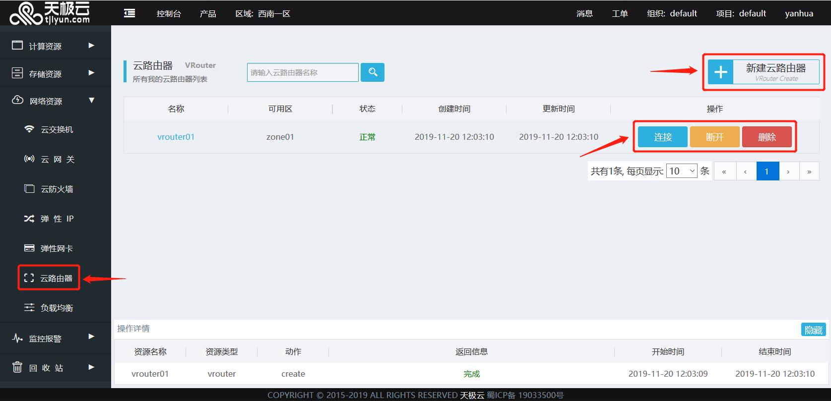 云路由器,用于连接不同云交换机下的云主机内部网络。需注意,通过云路由器连接的云交换机下的网络ID不能相同,否则会造成网络冲突,导致云主 机网络连接异常。