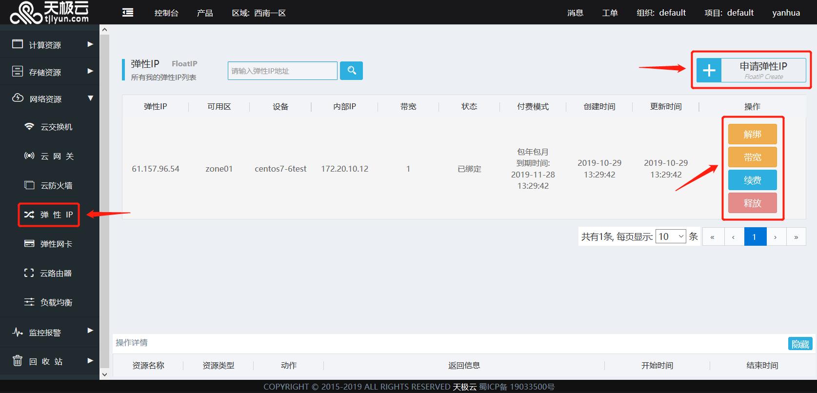弹性ip,用于外部网络连接并访问云主机。弹性IP绑定某台云主机后,该云主机上的服务就可以发布到公网上。绑定弹性IP的云主机,需要连接的云交 换机已关联云网关。