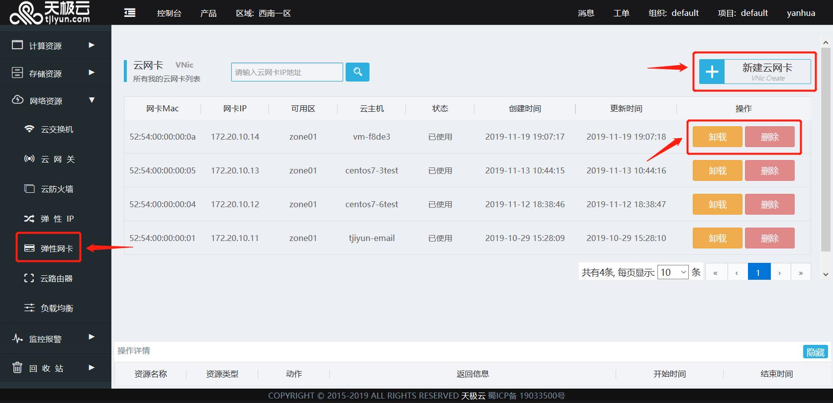 弹性网卡,用于连接云主机内部网络。弹性网卡创建后自动关联并连接到用户指定的云交换机,一块弹性网卡只能连接到一台云交换机,并使用该交换 机连接的网络。当某些特殊情况下,云主机需要使用多块网卡时,可以通过创建弹性网卡并添加到云主机,以使云主机能够同时连接多个网络。