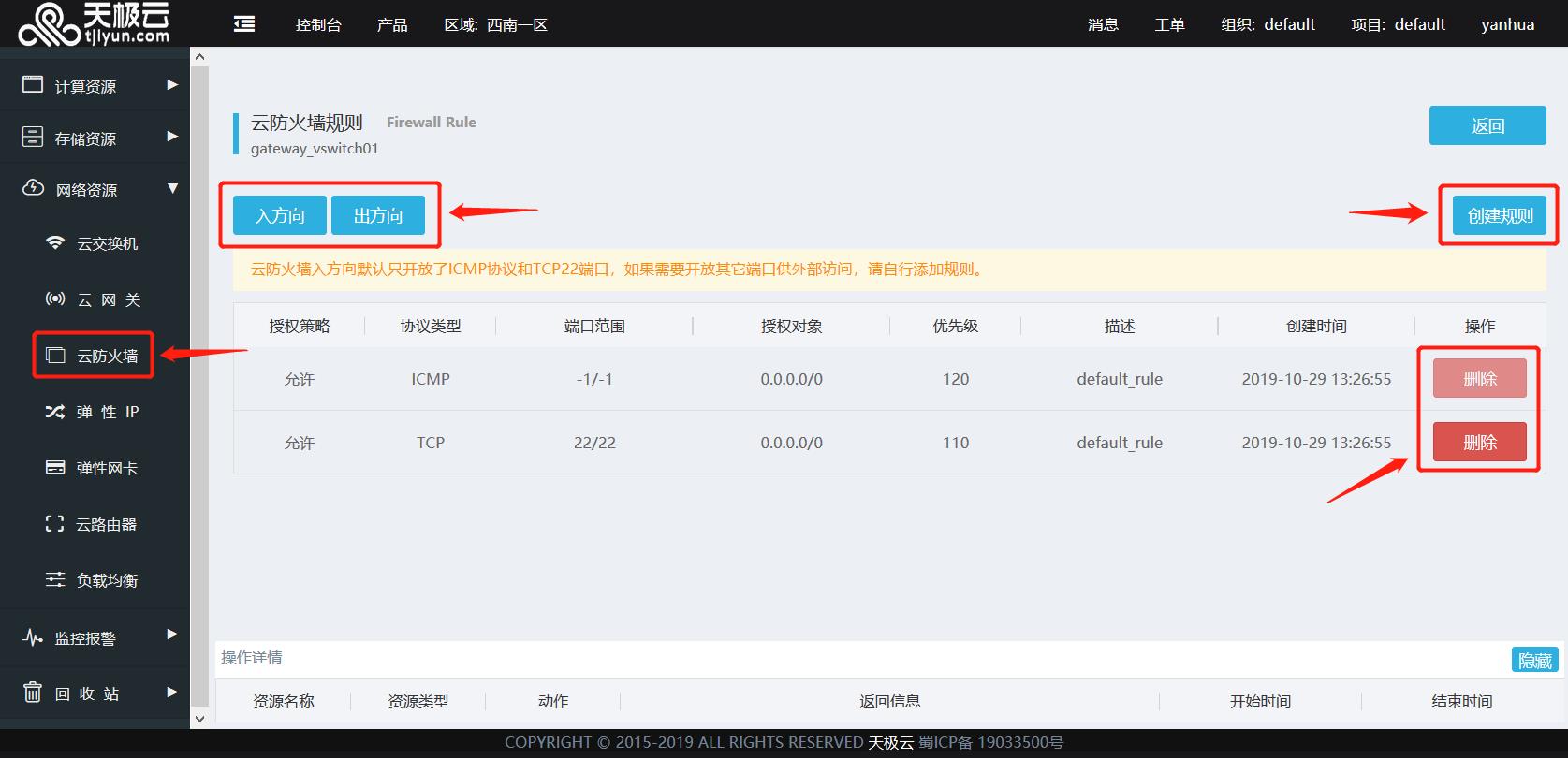 云防火墙,用于保护云主机内部网络。云防火墙位于云网络网关位置,提供对同一网关下所有云主机的保护。云防火墙规则设置分入方向和出方向,入 方向指外部网络访问云主机内部网络的连接,出方向指云主机访问外部网络的连接。云防火墙入方向默认只开放了ICMP协议和TCP22端口,如果需要开放其它端口供外部访问 ,用户可根据自己业务应用的具体情况,开放相应的端口访问。云防火墙出方向默认允许所有访问,即该防火墙内的所有云主机访问外部网络都是放行的,如需关闭云主机对外部网络的相关端口访问,可自行添加相应的规则。