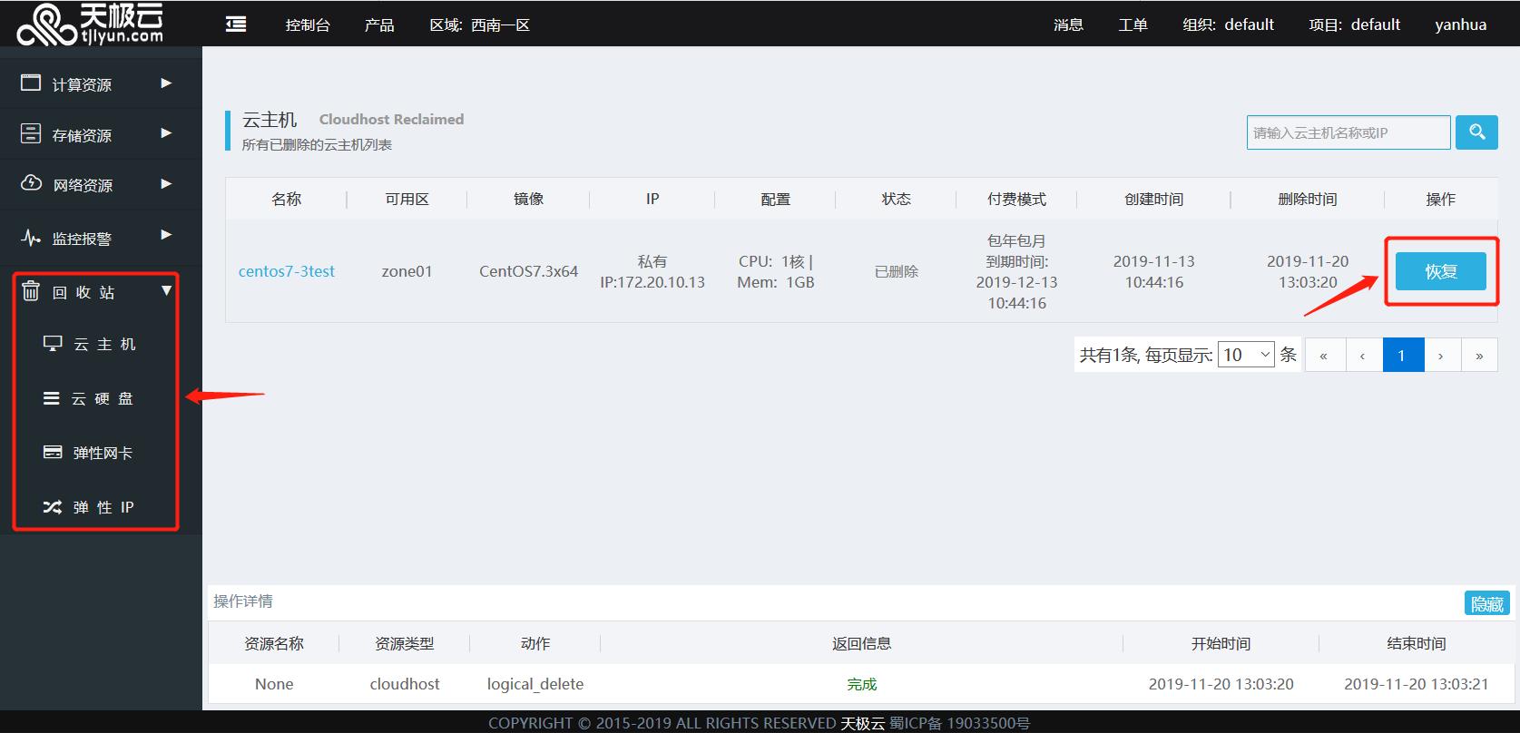 回收站,用于暂时存放用户删除的重要云资源,在7天内,允许用户恢复已删除的云资源,超过7天后,系统将彻底回收该资源,届时将无法再恢复删除 的云资源。回收站主要用于防止因为用户误删除导致的云资源被释放,当前可放入回收站中的云资源为云主机、云硬盘、弹性网卡、弹性IP。